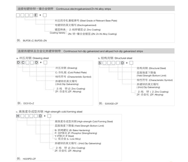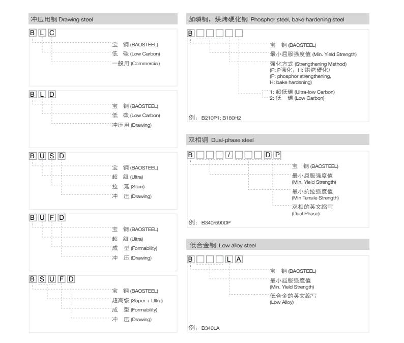 寶鋼產品的牌號一部分直接使用國外標準的牌號,一部分采用自己的命名方式命名。現簡要介紹寶鋼自己命名的牌號的方法。