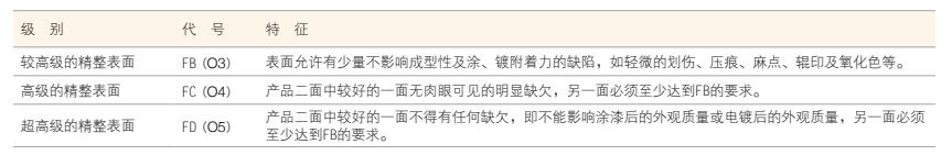 針對國內鋼廠無法生產超高級精整表面質量鋼板(O5板)的現狀,寶鋼積極組織生產、科研方面的人員大力攻關,在國內首先開發出了O5板這一冷軋精品,并實現了穩定批量供貨,極大地滿足了汽車用戶的需求。目前寶鋼生產的低碳及超低碳鋼板不僅被廣泛地用于制作汽車的內部零件,而且還被大量用作表面質量要求高的轎車及客車等汽車的外覆蓋件。鋼板表面質量分為三個級別,以滿足不同用途的要求。如下表所示: