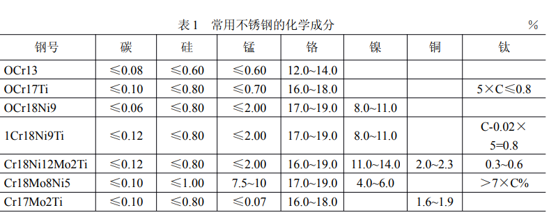 韌性較大及具有良好焊接性能的品種:OCr1 3、OCr1 7Ti、Cr1 8、OCr1 8Ni9、Cr1 8Ni8、1 Cr1 8Ni9Ti、Cr1 8Ni1 2Mo2Ti、Cr1 8Mn8Ni5、1 Cr1 7Ni1 3Mo2Ti、Cr1 7Mo2Ti。但用得比較多的還是 Cr1 8Ni1 8、Cr1 7Ti和 1 Cr1 7Mo2Ti。