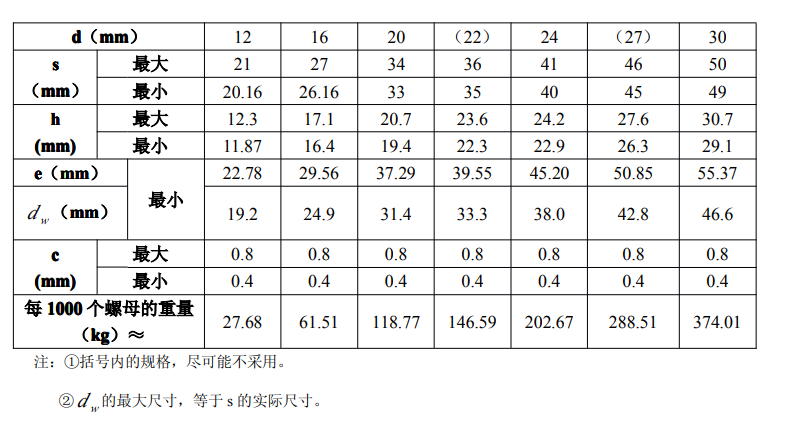 鋼結構用高強度大六角螺母的規格、尺寸及重量